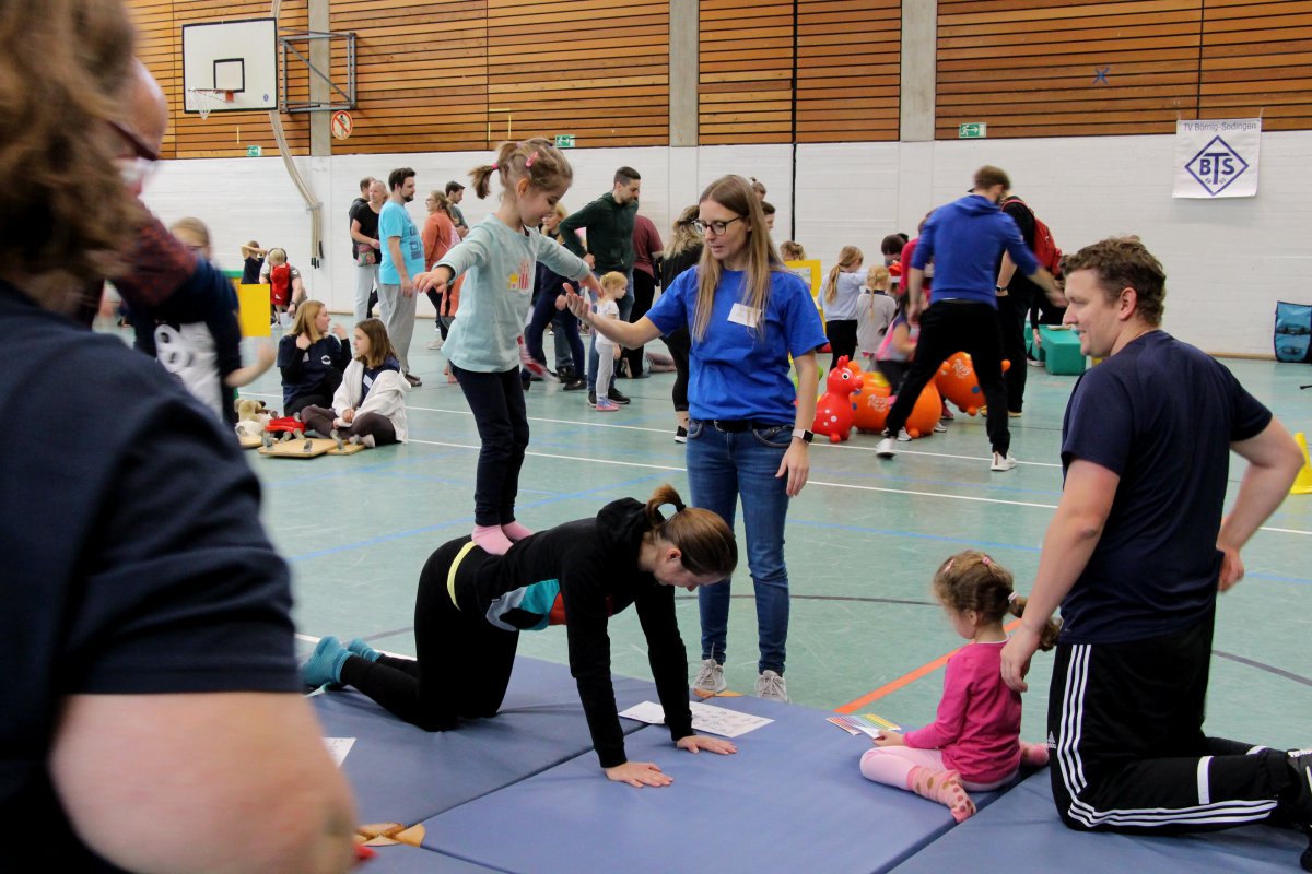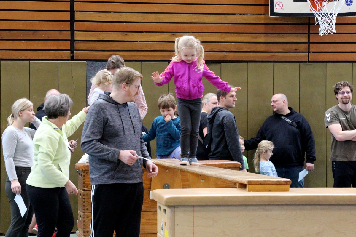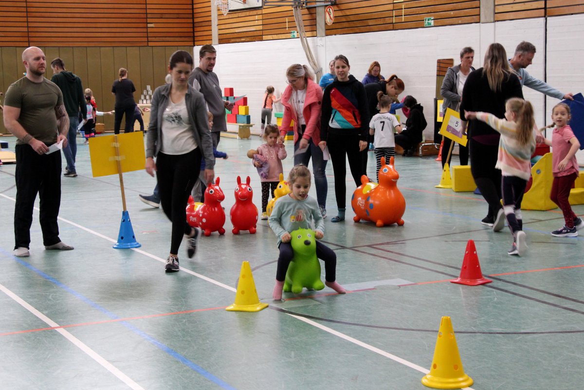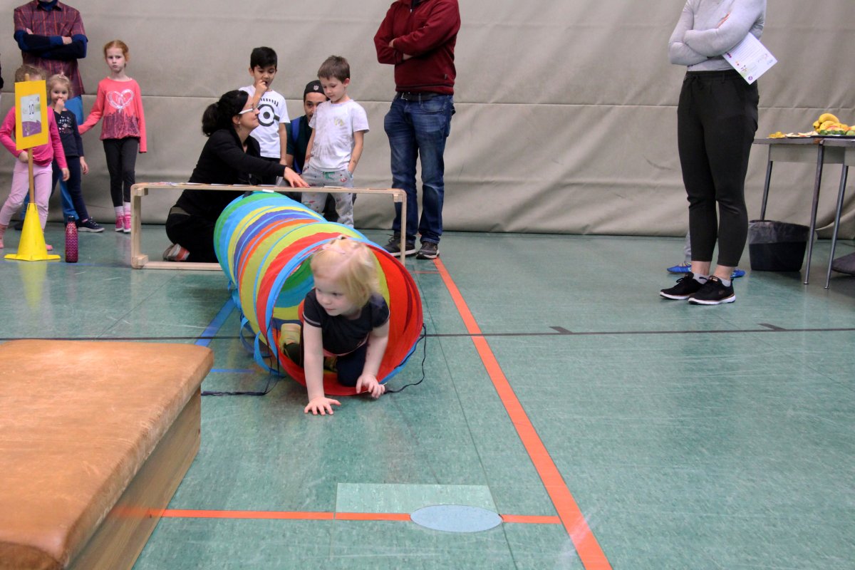 Ende November war es so weit, von 102 angemeldeten Kindern im Alter von 3-6 Jahren, absolvierten 65 Kinder und ihre Eltern zum 4. Mal das Kinderbewegungsabzeichen. Kinder und Eltern hatten viel Freude an den 10 Stationen, sie balancierten, warfen Dosen, sprangen von Kästen und transportierten Kuscheltiere mit Rollbrettern durch die Turnhalle. Am Ende erhielten alle Teilnehmer mit strahlenden Augen eine Urkunde, eine Medaille und ein kleines Geschenk.